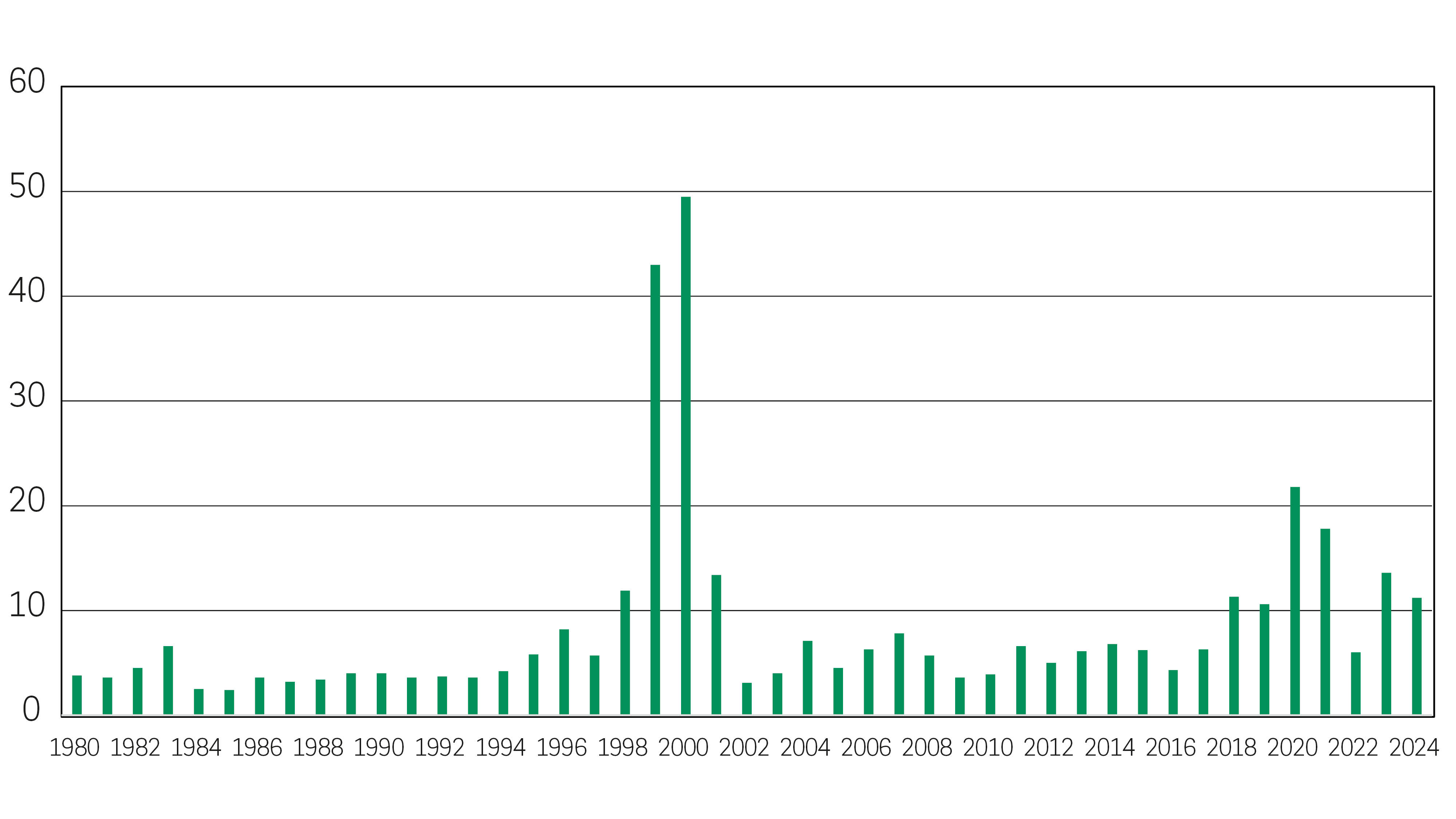 Data as at 29 September 2025. Source: Initial Public Offerings: Updated Statistics, Jay R. Ritter, University of Florida, table 4a.
