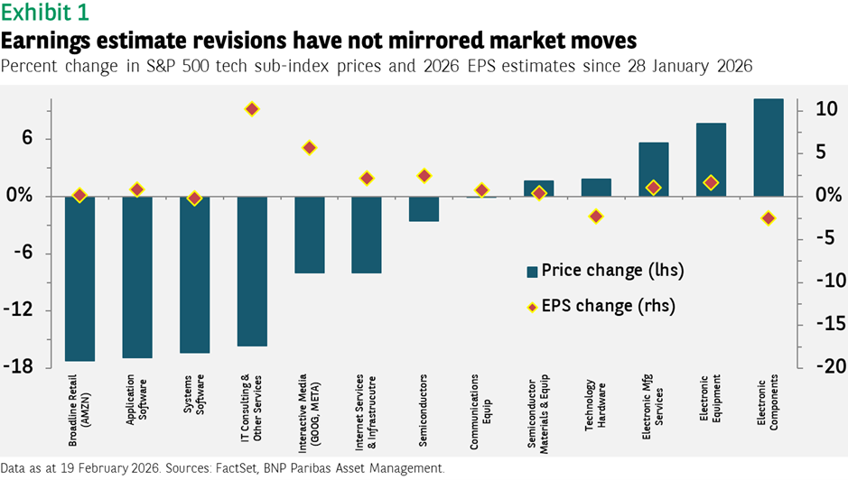 There seems to be little doubt that some companies will not survive this period of rapid technological change (RIP Napster and Blackberry), but one can question whether the market moves have gone too far. While the S&P 500 Application Software and Systems Software indices have fallen 16% since the end of January, revisions to 2026 earnings estimates have actually been modest (see Exhibit 1).