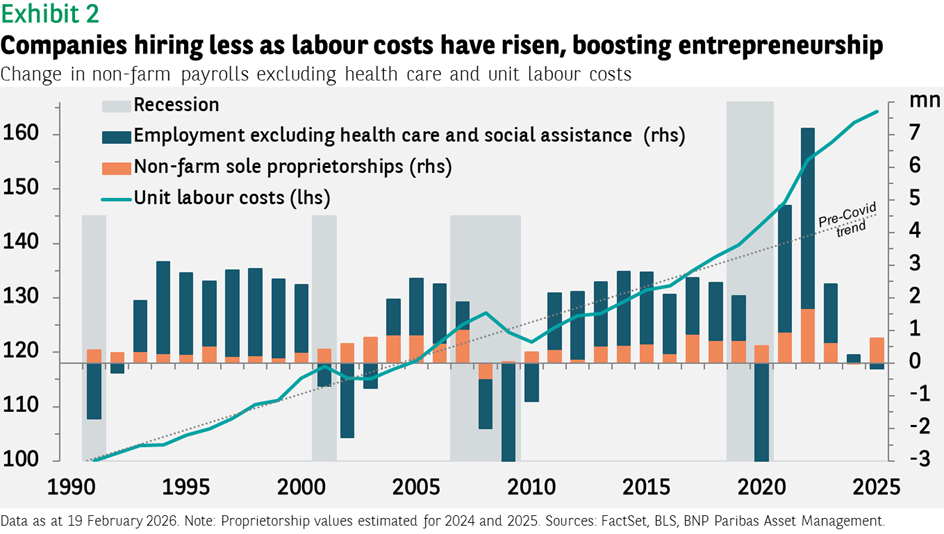 One puzzle these days is the strength of US economic growth alongside weak hiring (outside of the healthcare sector). Over the last two years, private non-farm payroll growth ex-healthcare has averaged just 40,000 compared to 1.8 million in the five years before the pandemic (see Exhibit 2).