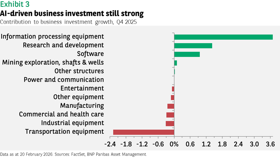 Business investment is arguably the most critical figure, as companies spending money to develop and power AI is a key factor in forecasts for robust US growth this year. The headline figure was discouraging - a mere 0.5ppt contribution thanks to an unusually big decline in the (lumpy) transportation equipment category. But the detail shows that AI-related spending remained strong, though a large part of the IT equipment category was chips imported from Taiwan. Nonetheless, the thesis that AI will continue to be a key support for the US economy remains in place.