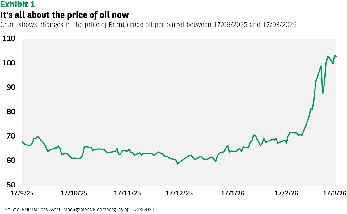 The effective closing of the Strait of Hormuz, described by the International Energy Agency as the “largest supply disruption in the history of the global oil market”, has driven oil prices up by around 40% since the start of the Middle East conflict. Barring a sudden resolution and the Strait reopening, the energy shock could worsen, leading to higher inflation, which would negatively impact consumers’ real incomes and business profitability. The longer it goes on, the more the growth outlook is threatened. For this reason, the oil price is significant for investors. What comes next in terms of returns depends now on the size, breadth and persistence of this energy shock.