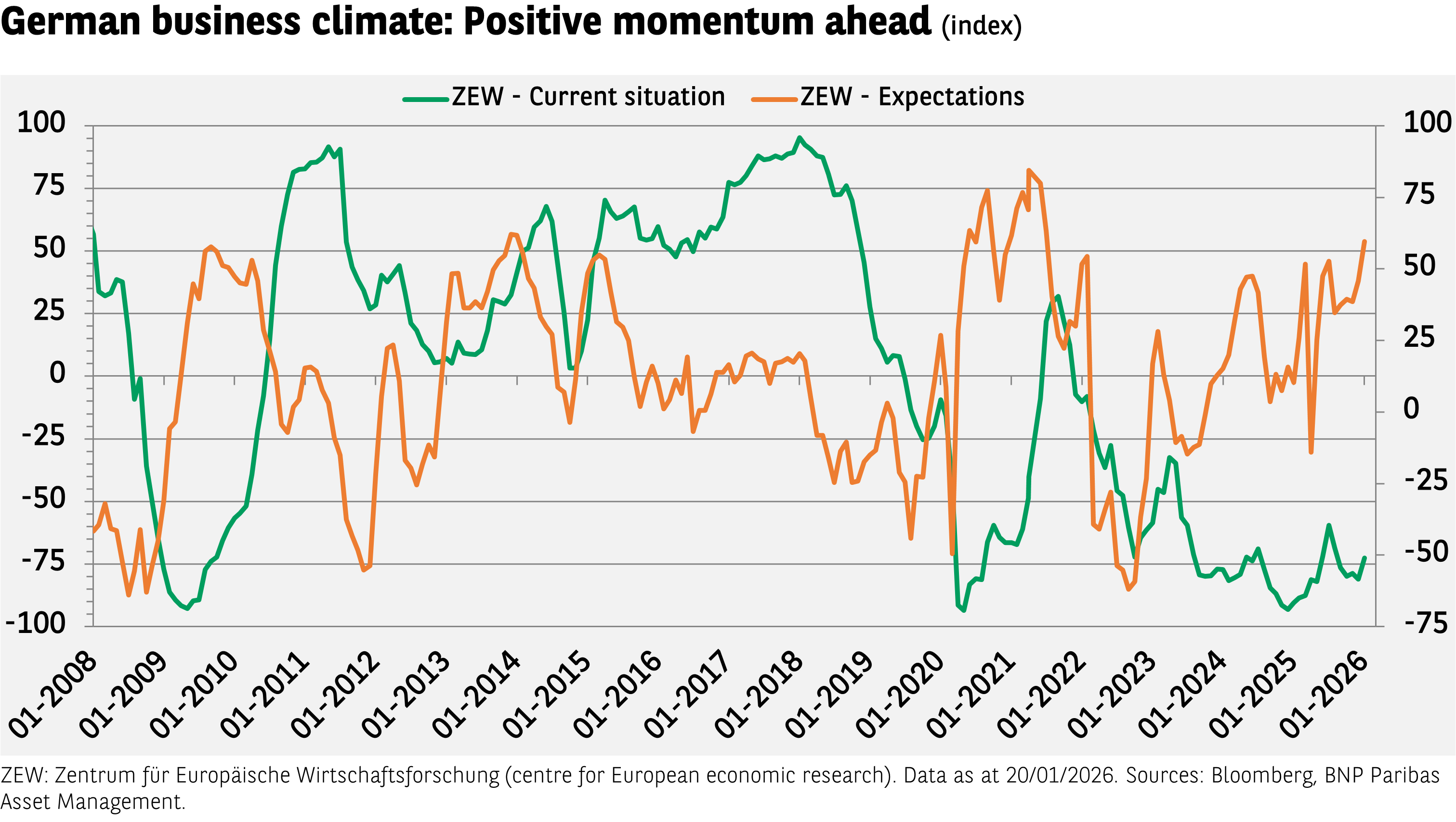The ZEW Indicator of Economic Sentiment - a survey of German financial analysts and investors - increased markedly in January, to its highest level since July 2021. This rise signals hopes for a ‘new momentum’, fuelled by Germany’s massive infrastructure and defence spending plans. Order books are on the rise and industrial production at the end of 2025 was significantly higher than expected. The assessment of the current economic situation also improved, albeit more modestly, but is nevertheless encouraging. Is it time to become more confident in Germany’s potential?
