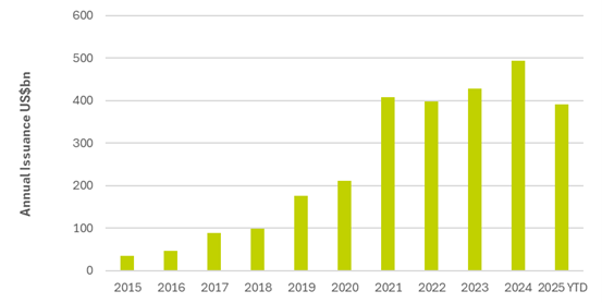 The green bond market has proved resilient, persevering across periods of market turbulence to reach significant scale in terms of annual issuance volumes. Even during the highly turbulent months of 2020 for example, green bonds held their own with supply persevering at levels similar to 2019 before accelerating in the second half of that year to surpass historical volumes. Primary market demand remained relatively unaffected, signalling that the market had already developed a solid and reliable investor base2. After a record year of issuances in 2024, 2025 has still proved resilient YTD and broadly similar to the level of volumes we have experienced in recent years.