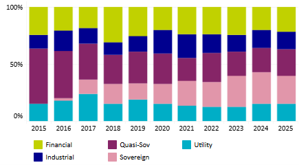 Today, as the chart shows, the universe includes sovereigns, supra-nationals, banks, utilities, and corporates across both developed and developing markets.
