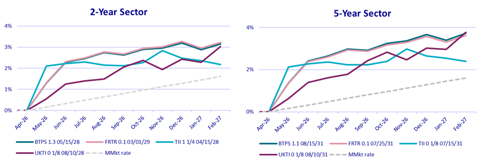 With what we see as a fair pricing of inflation expectations, we believe that the main source of performance for short-dated inflation-linked bonds increasingly relies on realised inflation: The recent energy shock and the consequent uplift in prices will translate into higher income coming from inflation indexation.